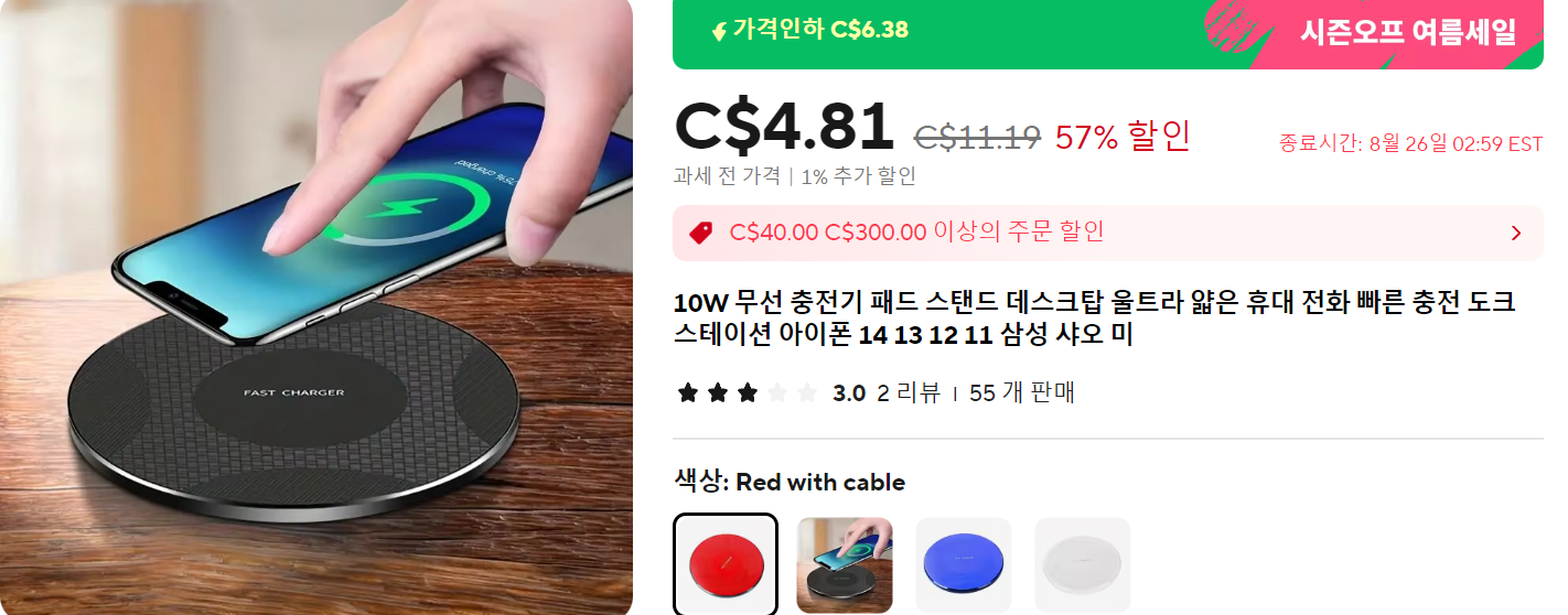 알리에서 최소 금액 30,000원을 맞추려고 뭐 살까 고민하다가 무선충전기를 구입하기로 했습니다. 잘 때 대충 이어폰이랑, 핸드폰 놓고 자고 싶은데 꼽는 행위가 귀찮더라고요. 그래서 저렴한 제품을 찾다가 아래 제품을 선택했습니다.