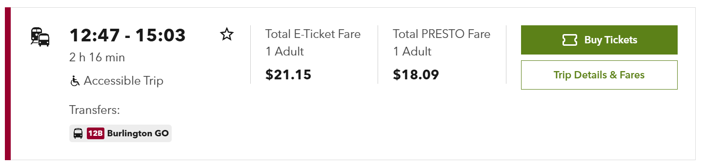 결국 갈 때는 고트레인과 고 버스를 선택했습니다. 12:47분에 벌링턴에서 환승하는 티켓을 끊었고 가격은 비슷했었습니다. 그러나 단점이 벌링턴에서 환승을 해야 하는 점 나이아가라 직행은 시간표가 적은 점이 단점입니다.