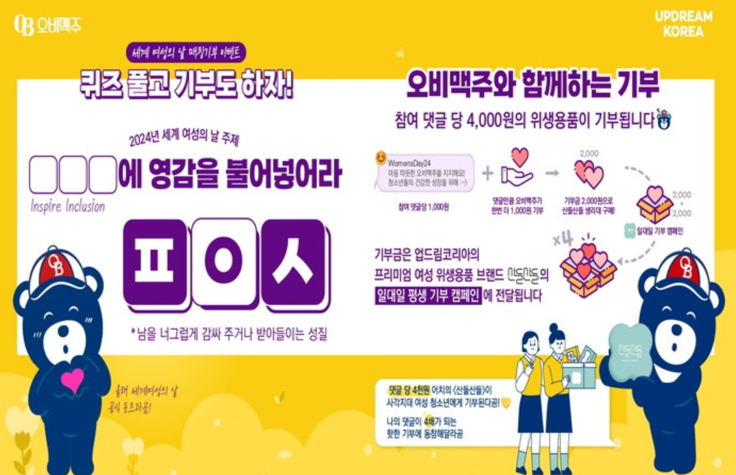 댓글당 천 원이 기부가 되는데 여기에 오비맥주가 천원 보태고 여성 위생용품 브랜드 "산들산들"에서 이천 원을 보태서 총 사천 원이 취약계층의 여성청소년에게 여성위생용품이 기부가 된다고 합니다.