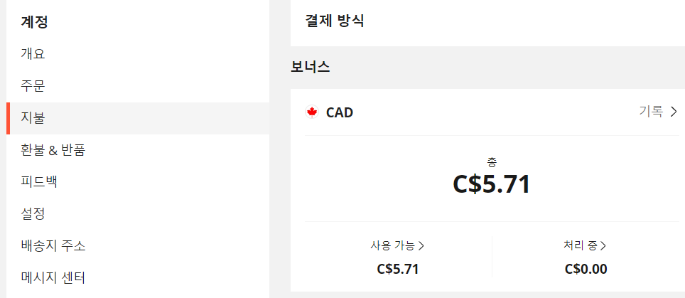 보너스 확인 방법은 계정> 지불을 누르면 바로 볼 수 있습니다. (저는 캐나다달러로 설정해서 그렇고 국가 설정 한국으로 하시면 원화로 보실 수 있습니다.