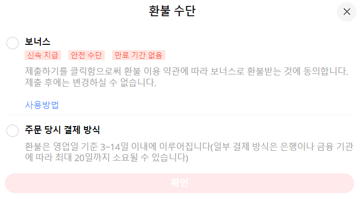 그런 다음 환불 수단을 결정해야 하는데 저는 알리에서 자주 구매해서 보너스로 선택하고 진행했습니다. 저 같은 경우 몇 시간 지나서 접수 및 처리가 진행됐고 곧바로 보너스(알리포인트 같은 느낌)로 그 금액을 돌려받았습니다.