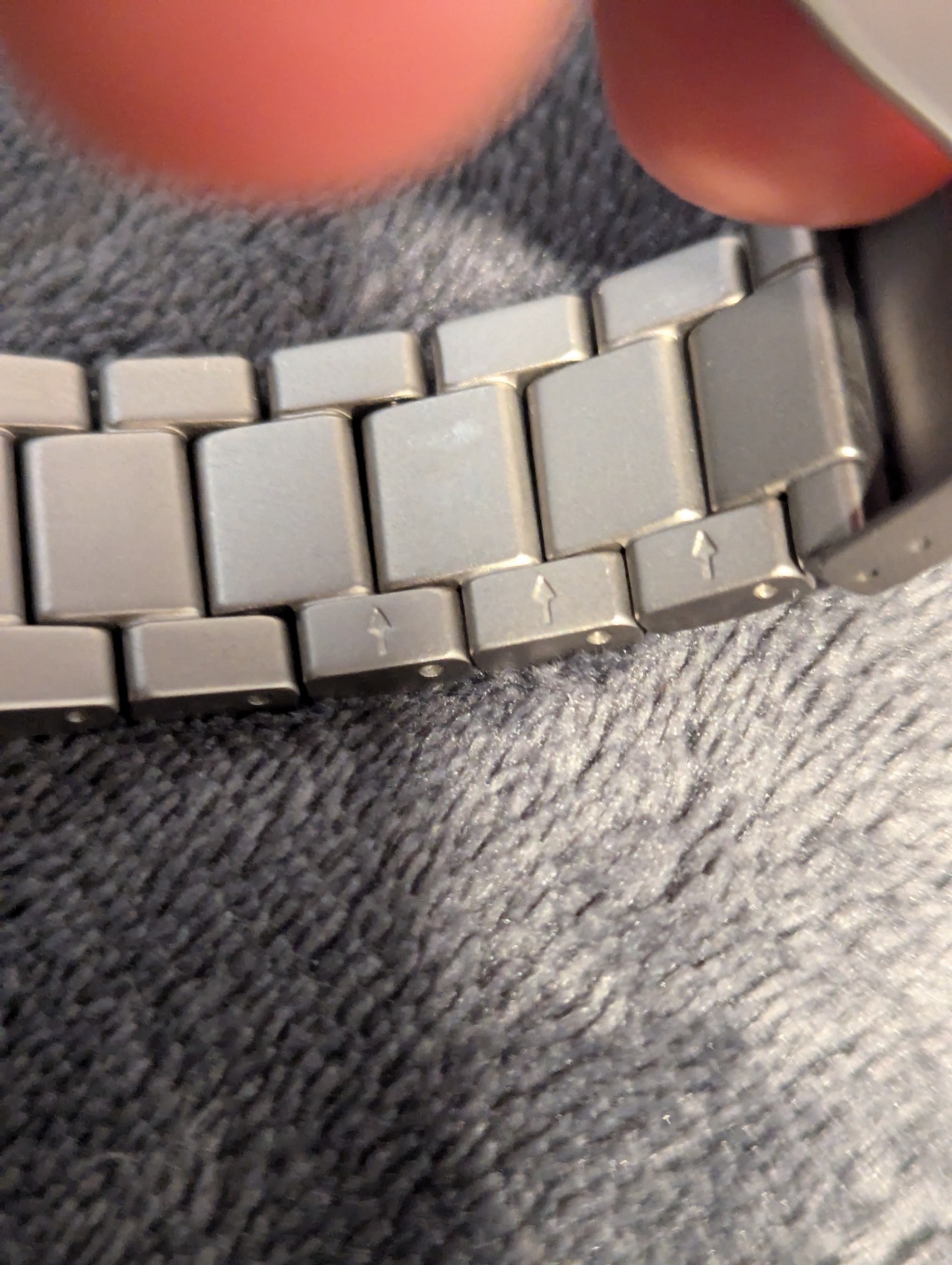 밴드 사이즈 줄이는 방법은 간단합니다. 저렇게 밴드 뒤에 화살표로 되어있는데 밴드를 직각으로 세우고 뾰족한 것을 저 구멍에 넣고 작은 망치로 톡 치면 빠집니다. 포인트는 직각 (90도로 잘 세워서 쳐야 함)