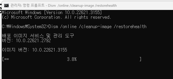 명령프롬프트를 관리자 권한으로 실행해서 위의 명령어를 쳤습니다. 그럼 아래 사진과 같이 검사를 진행하고 자동으로 끝나게 됩니다. 하지만 효과는 못 봤네요