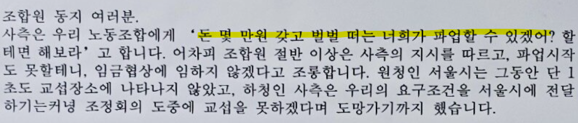 근무시간을 주로 치면 55.8시간이고 이걸 주6일로 쳐도 약 9시간 정도를 일해야 합니다. 그래서 계속 불만이 쌓이지 않았나 싶습니다. 게다가 사측에서 노동조합에게 "돈 몇만 원 가지고 벌벌 떠는 너희가 파업할 수 있겠어?"라고 조롱까지 해서 파업에 도화선이 되지 않았나 싶습니다.